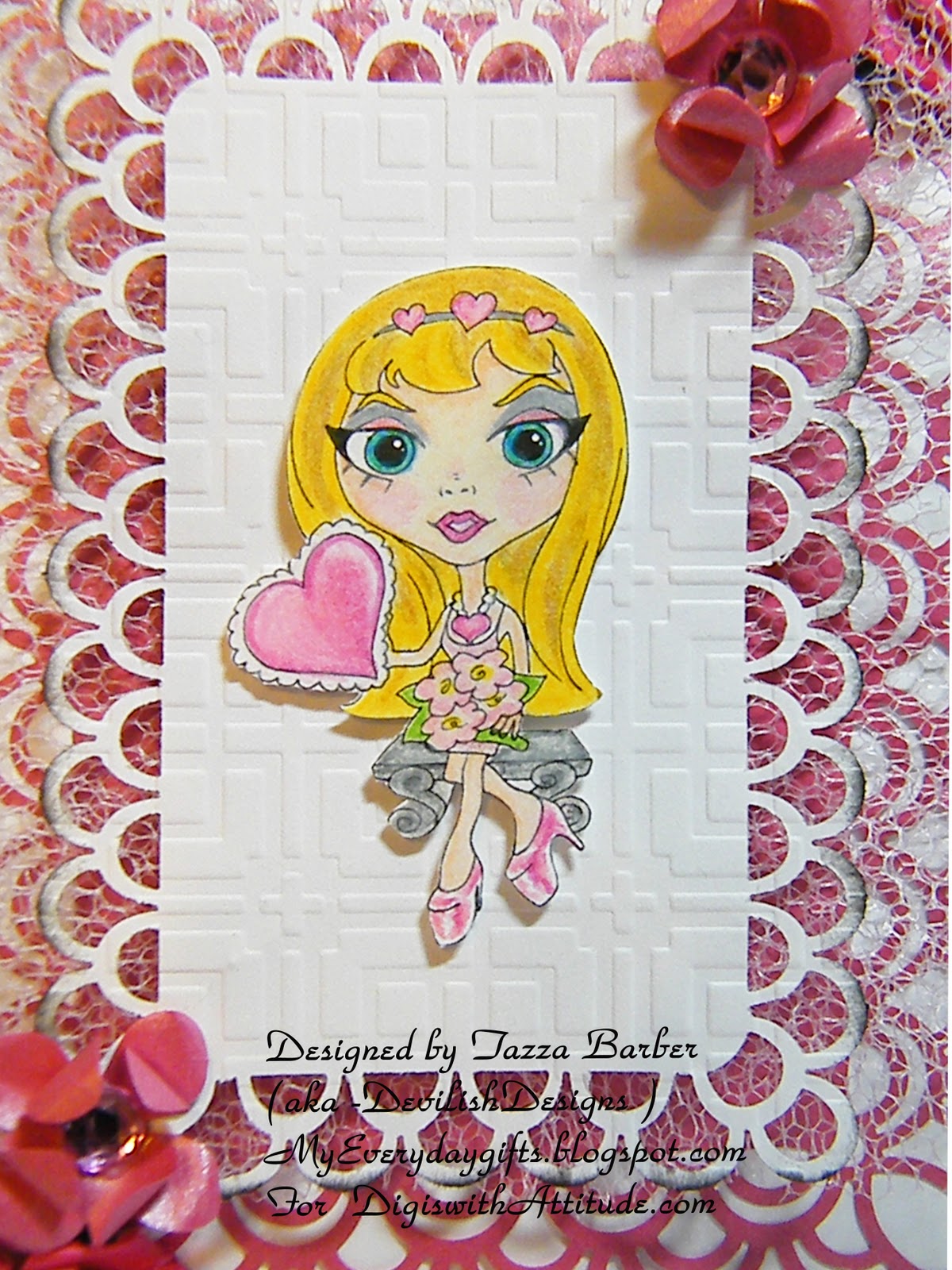 One of the things I worked on was this Valentine card for Digi's with Atttitude! It is a new Digi stamp that hasn't been released yet but today is the big day! Yay!!! So head on over to the shop and snap this pretty little lady right up for your lovely Valentines day Projects.